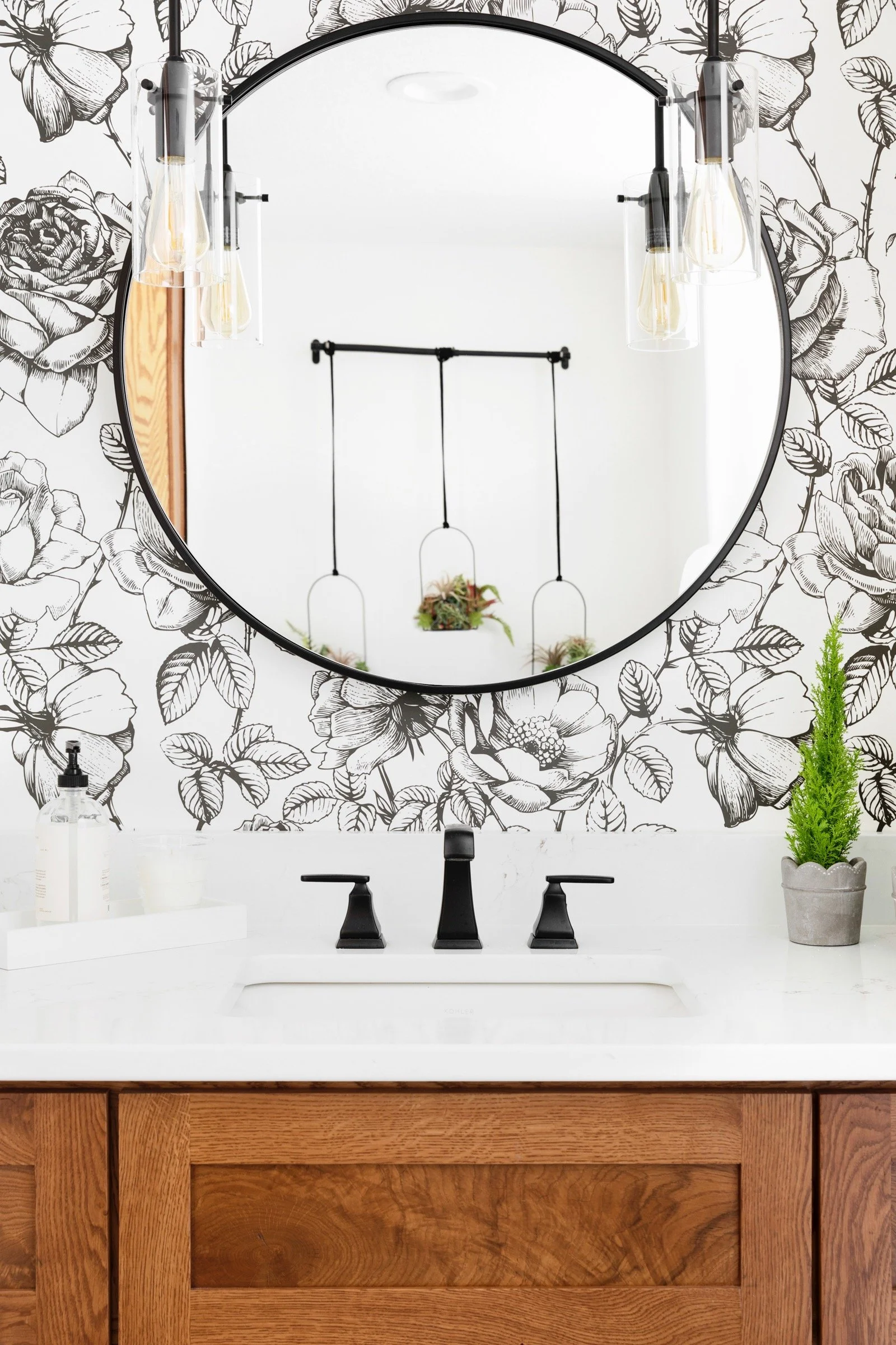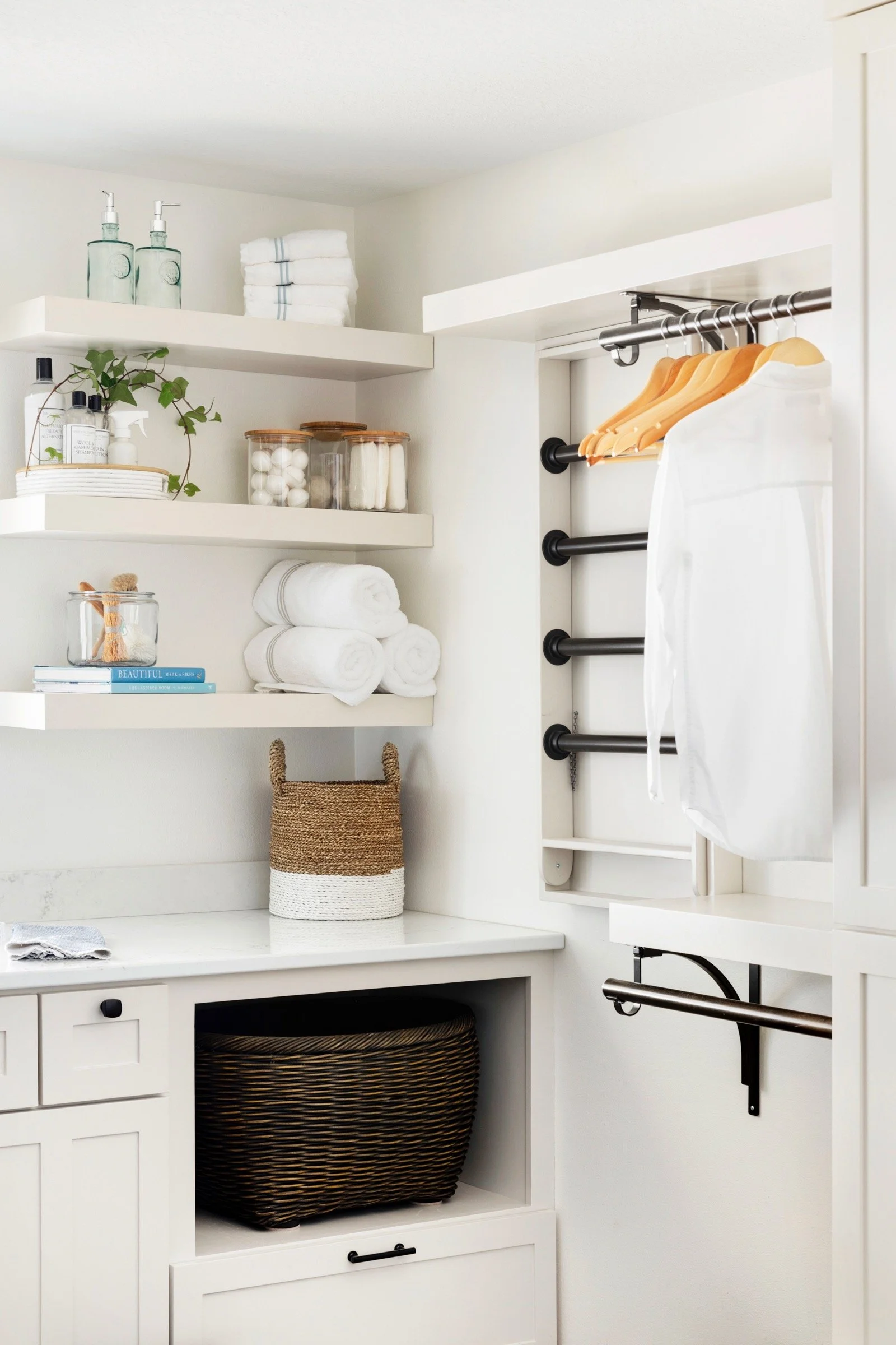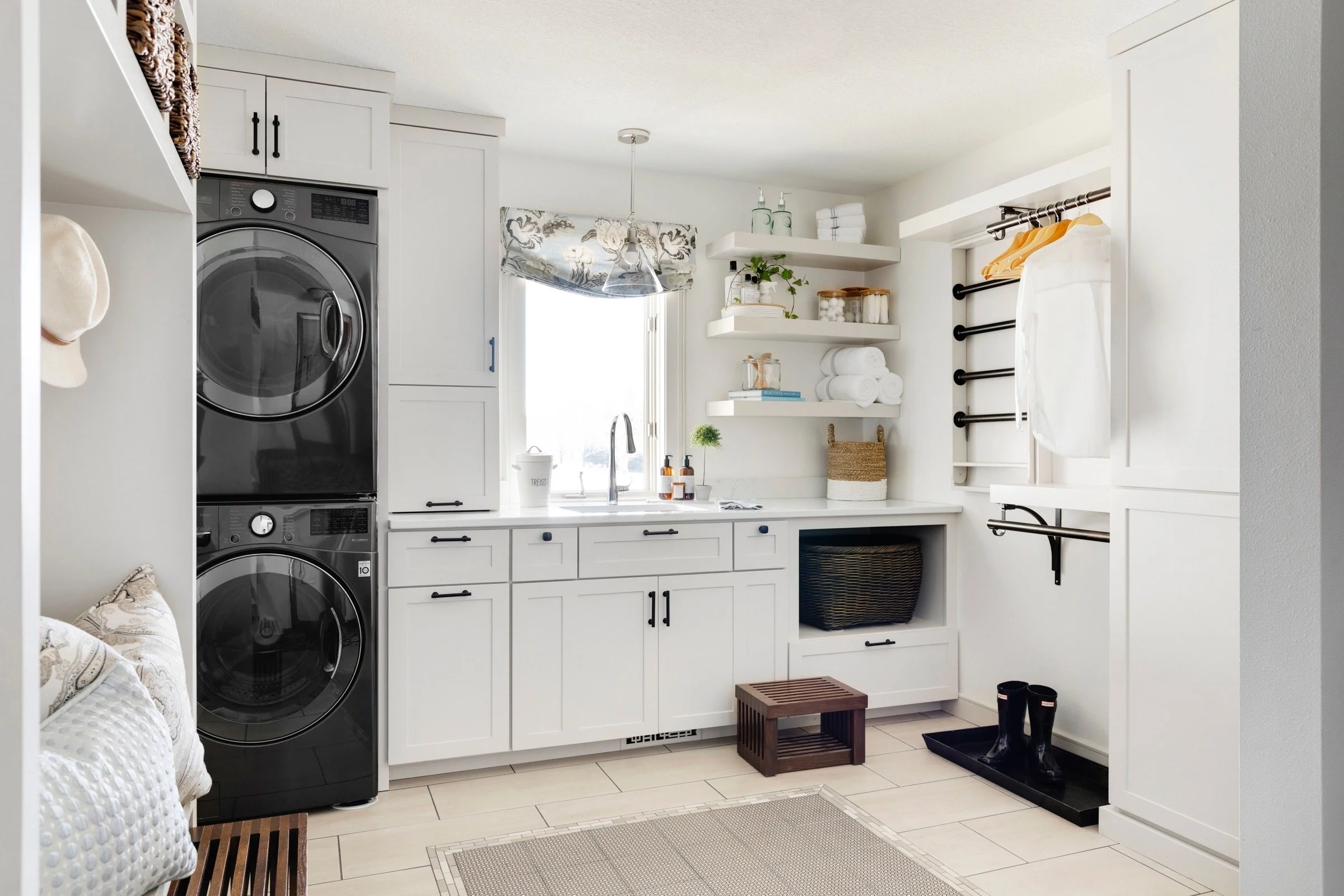Goal: To open up the back entry area. Make a bright, well-functioning mudroom and laundry. Remove unused shower and create a beautiful powder bathroom for guests and family.